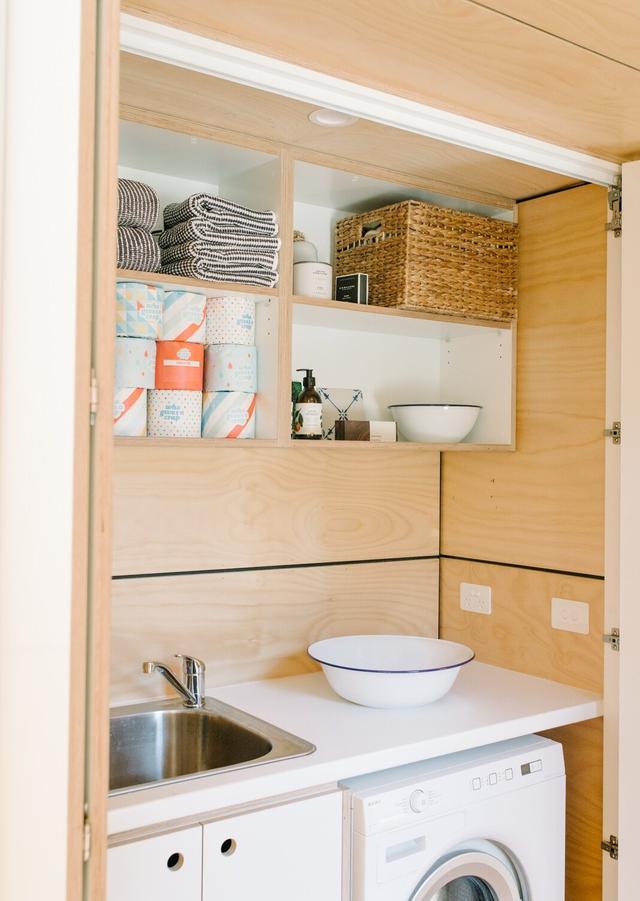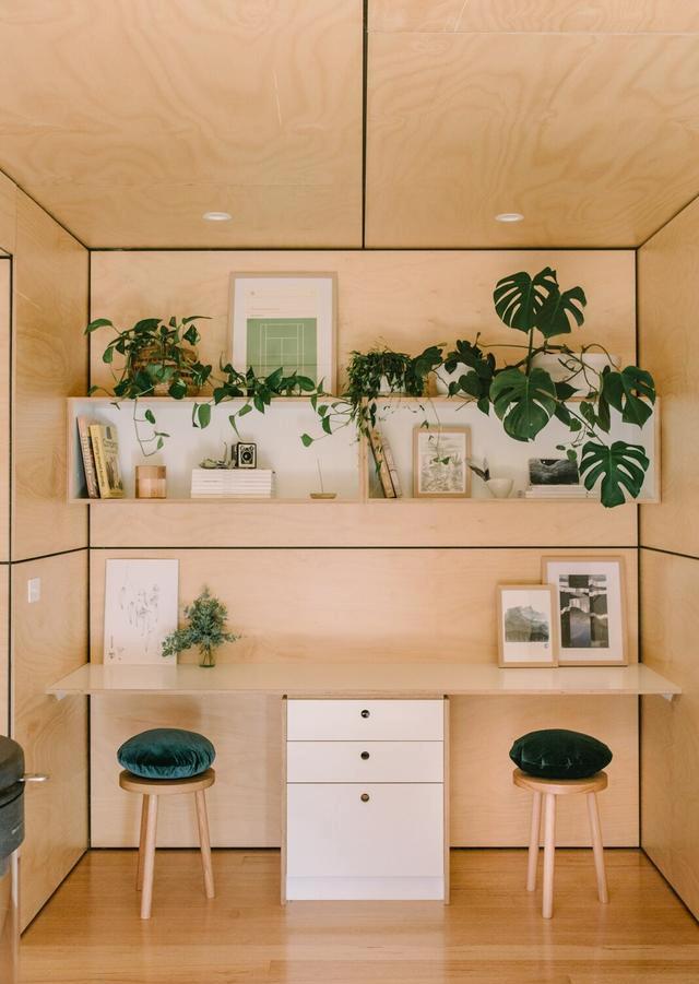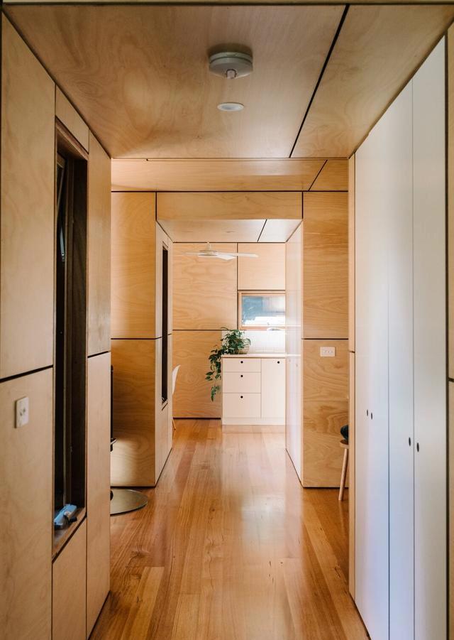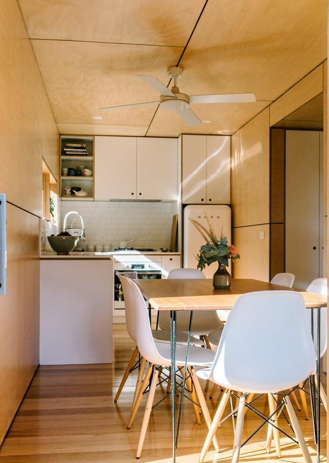 住宅的入口通往第一個(gè)集裝箱中的廚房和用餐區(qū)。生態(tài)膠合板墻、天花板和櫥柜,以及塔斯馬尼亞橡木地板,增加了外部金屬覆層的溫暖對(duì)比。