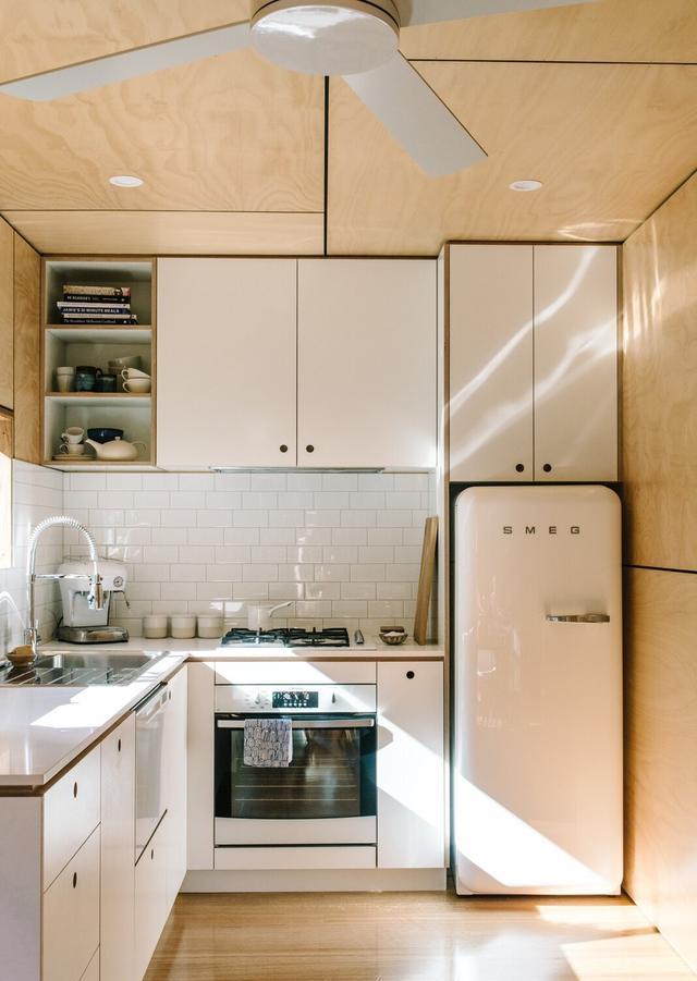低揮發(fā)性有機(jī)化合物、零甲醛的白色膠合板櫥柜、地鐵瓷磚的后擋板和石材臺(tái)面貫穿整個(gè)廚房。