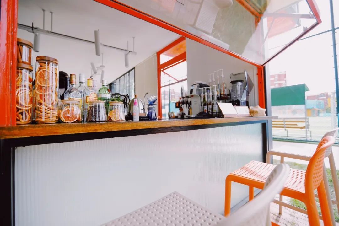 集裝箱咖啡館以橙色主基調(diào),每一面都開有落地窗或玻璃門,不僅將咖啡館融于糧倉(cāng)這一景點(diǎn)中,成為景色的一部分,也方便顧客從任一方位都可自由進(jìn)入內(nèi)部。