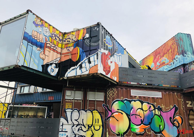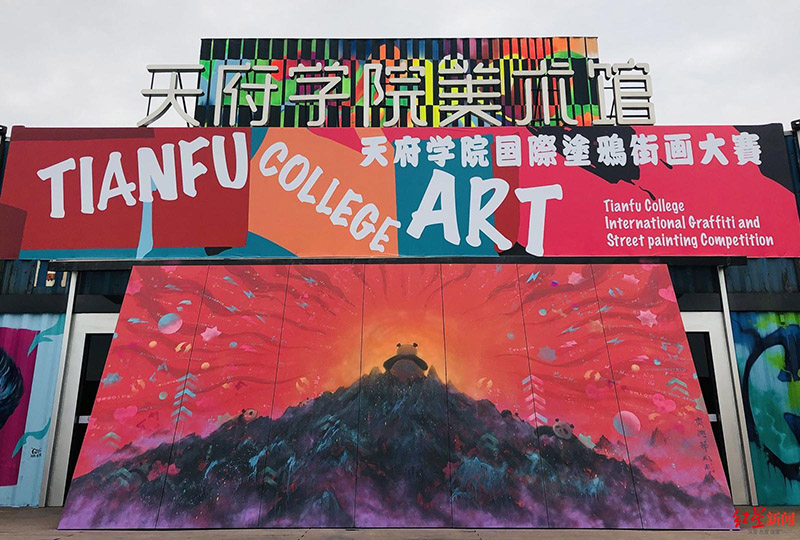 本次大賽的作品展示現(xiàn)場,是全國首座由78個(gè)集裝箱組成的西財(cái)天府學(xué)院美術(shù)館。其獨(dú)立而另類的建筑構(gòu)成和別具一格的外形,與基因中自帶奔放氣質(zhì)的涂鴉和街畫藝術(shù)相得益彰。大賽中入圍“上墻創(chuàng)作名單”的作品,就涂繪在這些集裝箱空間的外部。