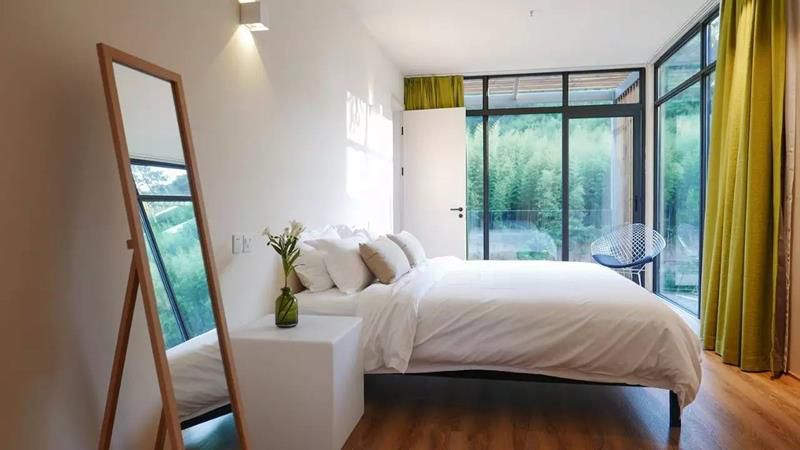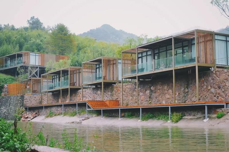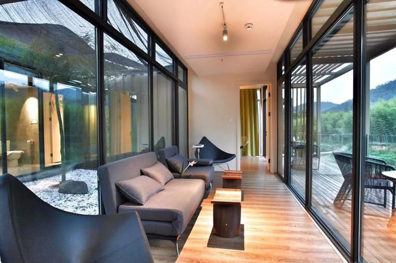 既然叫做“溪地”,必然有一條溪流。溪地整體建筑的線條顯得剛硬,旁邊流過(guò)的溪水正好柔化了它。來(lái)自?shī)W地利的設(shè)計(jì)師Genceo Berk將山水草木和現(xiàn)代工業(yè)結(jié)合出了別具一格的集裝箱精品酒店,有大面積落地窗的箱體,則種植了莫干山當(dāng)?shù)靥禺a(chǎn)的竹子來(lái)做天然屏障保護(hù)隱私。