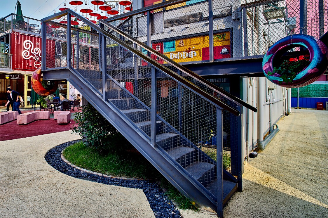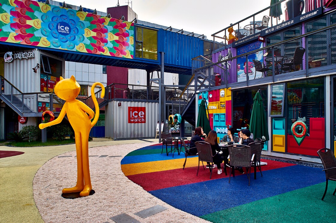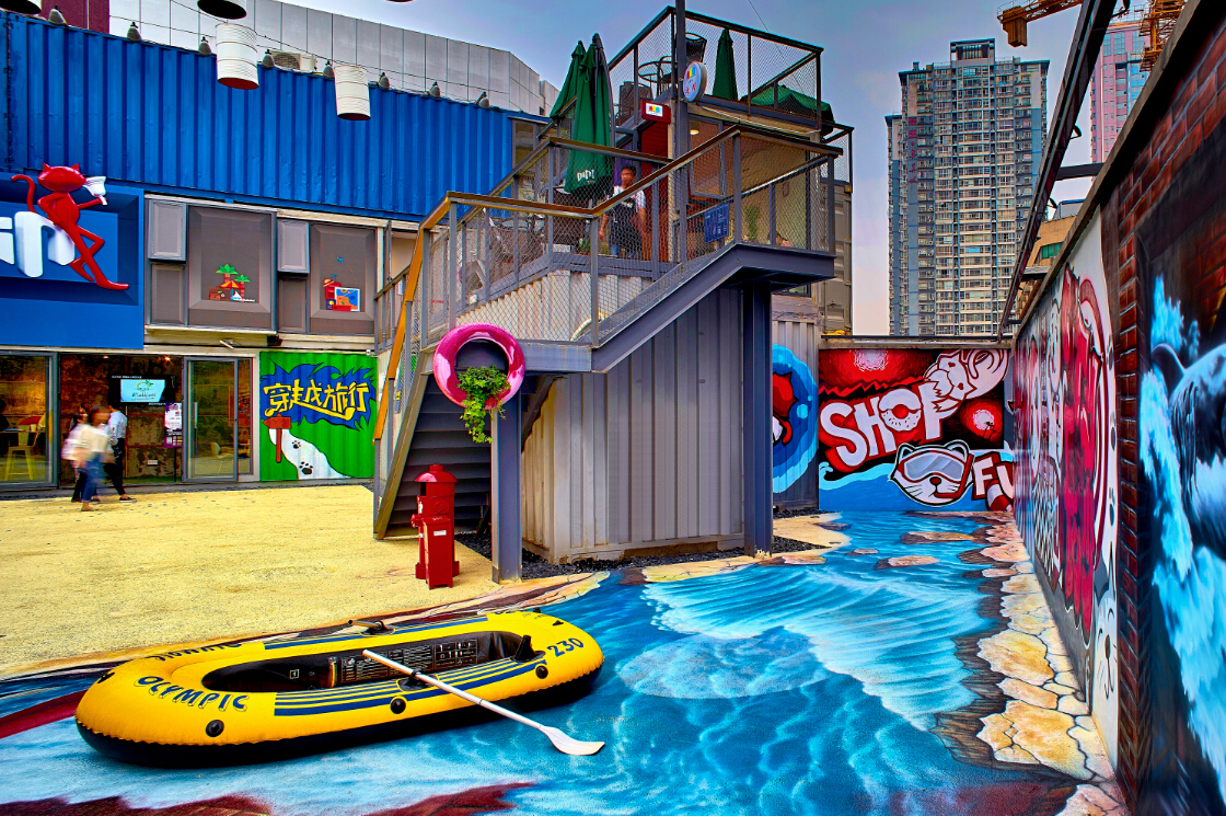 顏色絢麗,個(gè)性十足的涂鴉及獨(dú)特商業(yè)形象吸引了人們的眼球。27個(gè)特色的集裝箱交錯(cuò)堆疊組合展現(xiàn)于眼前,形成了別具一格的商業(yè)空間