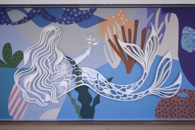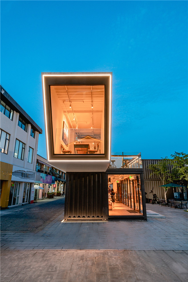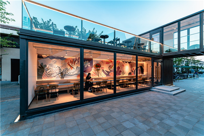 集裝箱空間都具有強烈的工業(yè)風(fēng)和極簡風(fēng),所在的智慧灣科創(chuàng)園也是一個以集裝箱為主題的個性化定制園區(qū),園內(nèi)還有中國3D打印文化博物館,可以體驗3D打印技術(shù)互動。一層獨立箱體的用餐區(qū)墻上,就有一幅3D打印的巨幅星巴克美人魚作品。
