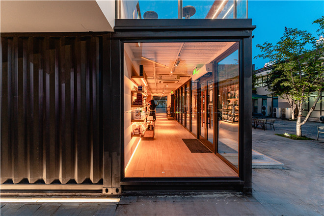概念店由6個大小不同、白棕相間的集裝箱穿插交疊而成,共有兩層。一層是交錯開來的點單區(qū)和用餐區(qū),并設(shè)置了大片通透的玻璃幕墻,從外界看可以將箱體內(nèi)的整體面貌盡收眼底。